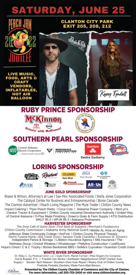 Peach Jam Jubilee 2022 will be held on Saturday, June 25 at Clanton City Park. Last year’s event was a huge success! The event attracted over 14,000 people to our community. The day was filled with fun and activities for all ages. The new layout allowed for vendors to enjoy the shaded area in Ollie Park and allowed for more room for our musical guest. We are looking forwarding to this year’s event which promises to be bigger and better. For information on the 2022 Peach Jam, please call our office at 205-755-2400. Please send completed sponsor and vendor applications to [email protected] or P.O. Box 2126, Clanton, AL 35046.