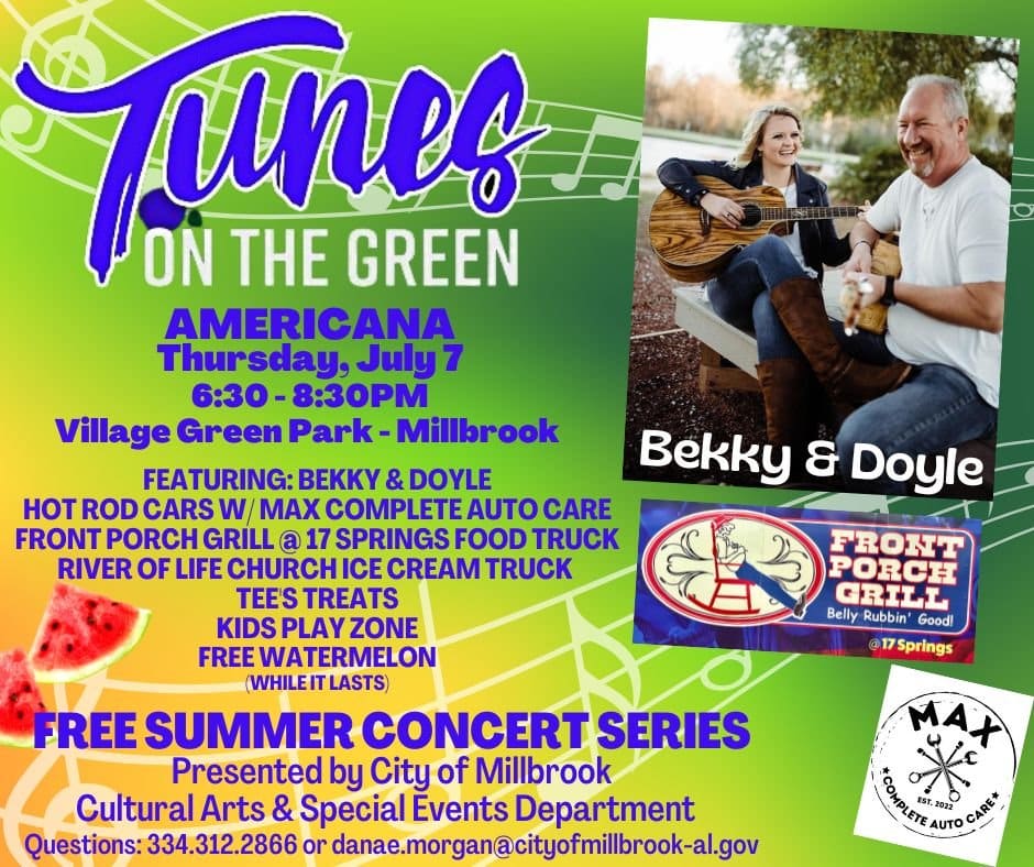 From the City of Millbrook – Make plans to join us for the concert of the season! Yep, it’s going to be HOT, but we’ve figured it out by putting a stage under the shade trees at the north end of Village Green Park which will be much more comfortable for everyone. Our Hometown Locals Doyle Campbell and his talented wife Bekky are the entertainment.