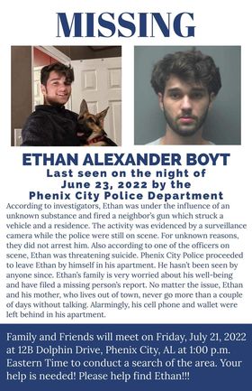 The Phenix City Police Department is asking for the public’s assistance in locating Ethan Alexander Boyt. Friends and Family of Ethan are also searching for him, and both sides have issued information.
