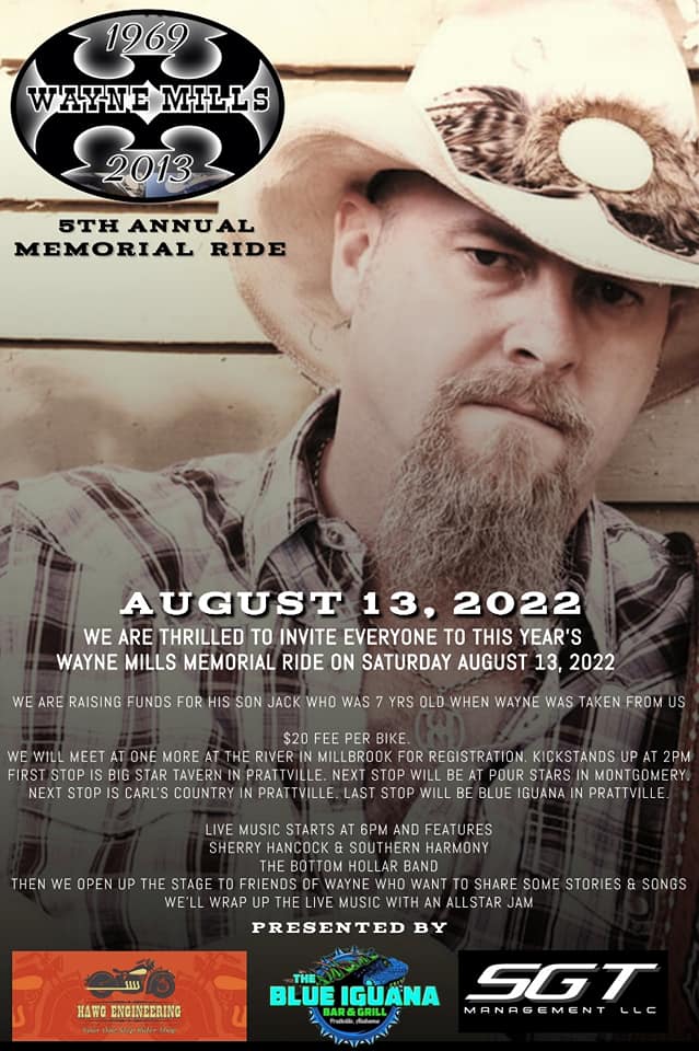 Wayne Mills Memorial Ride is Saturday with Multiple Stops before Concert at Blue Iguana in Prattville August 10, 2022