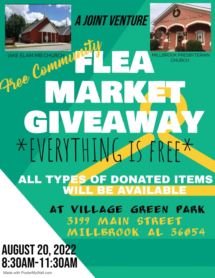 Lake Elam Missionary Baptist Church and Millbrook Presbyterian Church will host a Free Community Flea Market Giveaway on 20 August from 8:30 am thru 11:30 am or until all items are gone. This event will be held at Village Green Park in Millbrook. Come out and spread the word!