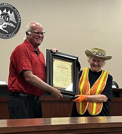 The City of Millbrook is a tidier place because of Carol Honaker and her tireless efforts to keep our community litter free. A Millbrook resident and retired nurse, Mrs. Honaker, 89, was recognized at last night’s City Council meeting for her service to the community. Mayor Kelley presented Mrs. Honaker with a Proclamation extending Millbrook’s heartfelt appreciation for her almost daily routine of picking up litter along Main Street and her neighborhood and encouraging others to do the same. She has been successful in recruiting others to join her in the war against litter. Mayor Kelley noted, “on my way to work, I would often see this lady picking up trash along Main Street but was always in too much of a hurry to stop and formally thank her. Well one day, I made time. I pulled over, introduced myself and listened to her story. We are blessed with this individual.”
