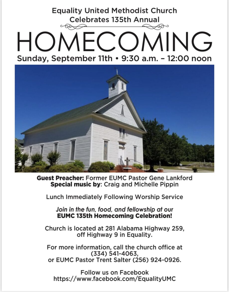 EQUALITY, ALABAMA – The 135th annual Equality United Methodist Church Homecoming is scheduled for Sunday, September 11,2022, at Equality UMC. The church is located at 281 Alabama Highway 259, off Highway 9 in Equality.