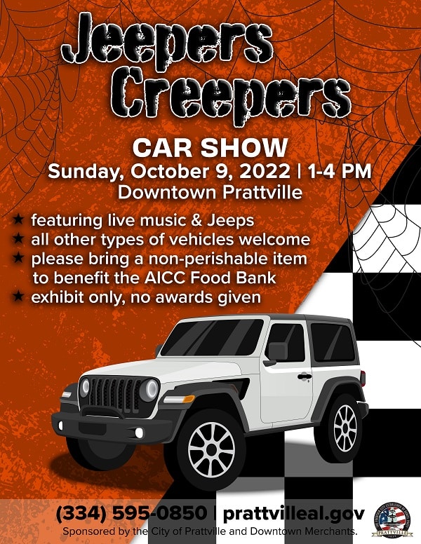 The City of Prattville will host its Jeepers Creepers Creekwalk Car Show on Sunday, October 9, at Heritage Park by the beautiful Autauga Creek Dam. In the spirit of Halloween, the second annual Jeepers Creepers show will feature Jeeps decorated for the season and many other makes and models of vehicles from antiques to new and innovative cars.