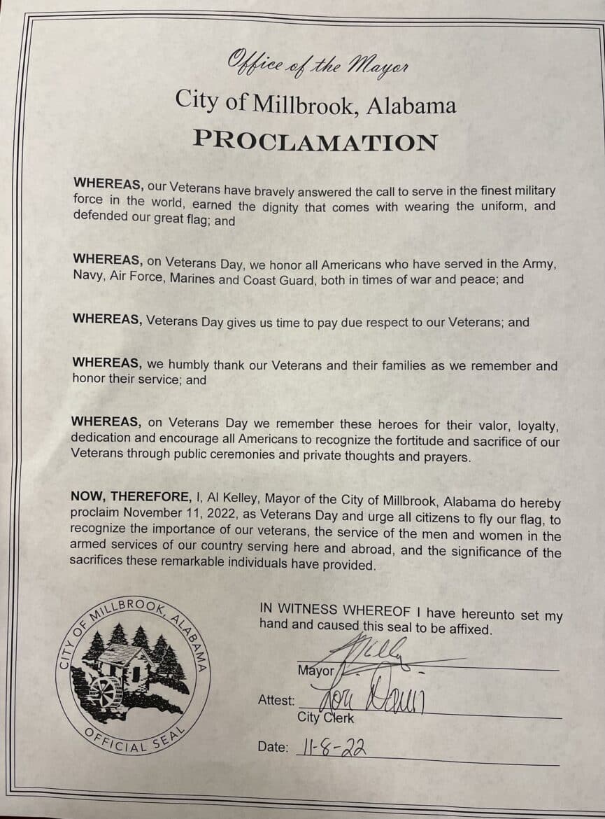 Millbrook Mayor Al Kelley recognized Veterans throughout the week of events, as well as a proclamation of thanks in their honor.