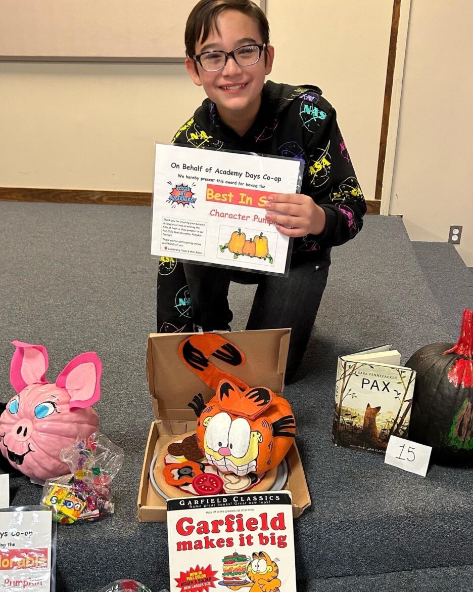 With a pumpkin decorated to look like the popular cat Garfield from Garfield Makes It Big, homeschooler Eliah Hall of Wetumpka wins “Best in Show” in the Book Character Pumpkin Contest at Academy Days Co-op recently.