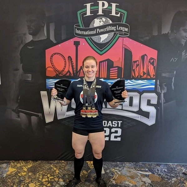 Andrea Armstrong competed in the IPL Drug tested world championship hosted in Gold Coast Australia. She competed in the 52kg weight class winning first place in the open women’s and junior category. She also won best female lifter in open women’s and junior. This award is given to one woman and one man for master, open, and junior. She set a deadlift world record at 391 lbs., squatted 336 lbs., and bench pressed 192 lbs.