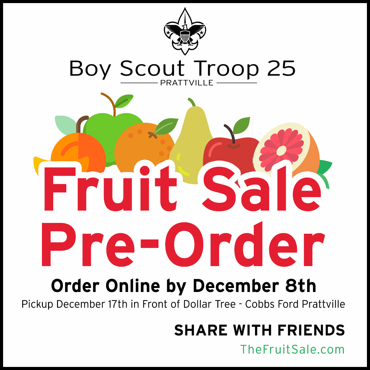 Prattville Boy Scout Troop 25 is selling fruit again this year with all proceeds going to benefit the Scouting program for Troop 25.