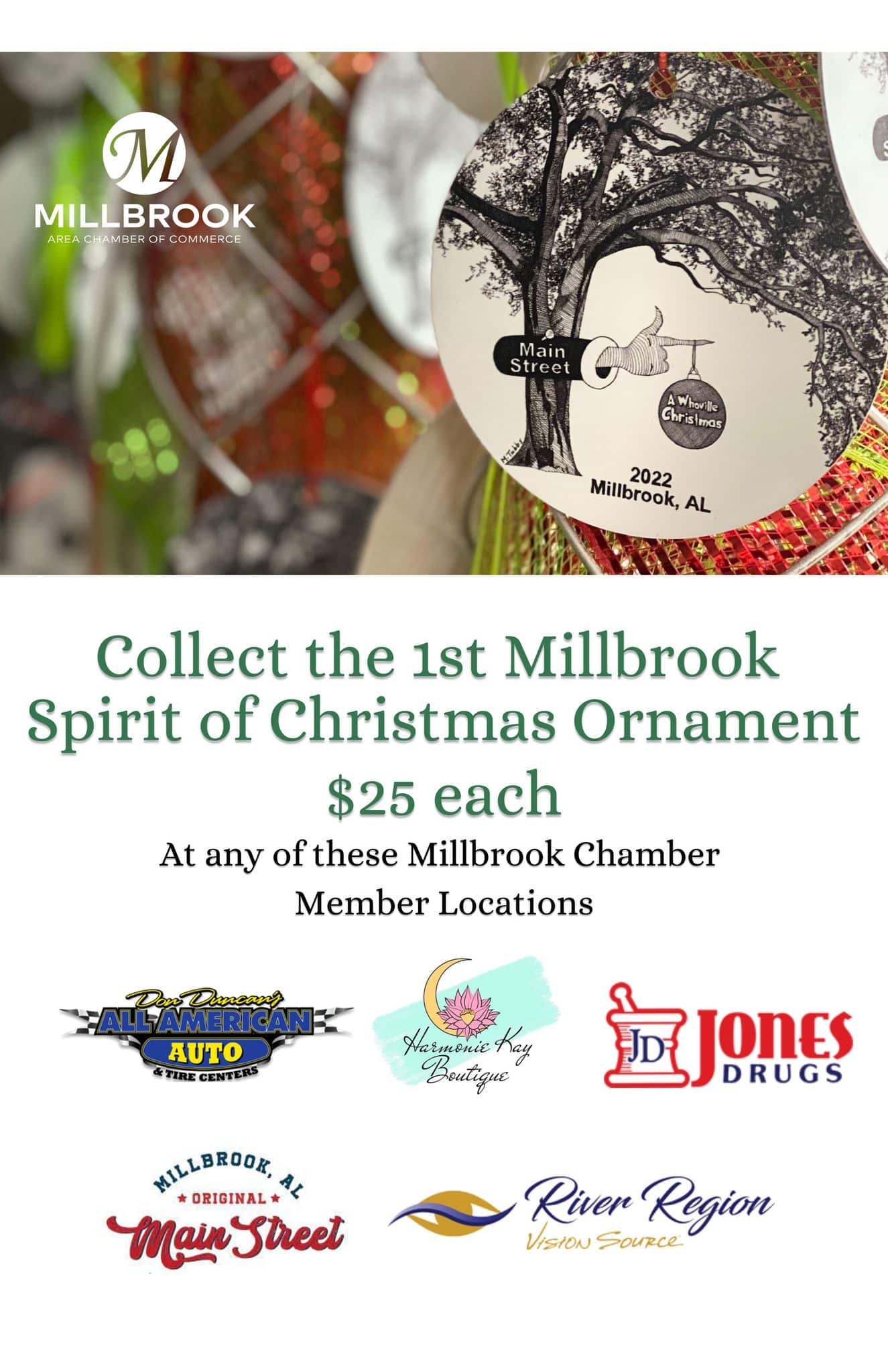 A One-of-a-kind Millbrook Spirit of Christmas ornament will be available at the event for $25. They are also available at various businesses in town. Supplies are limited, so get yours early. (See graphic listing locations.)