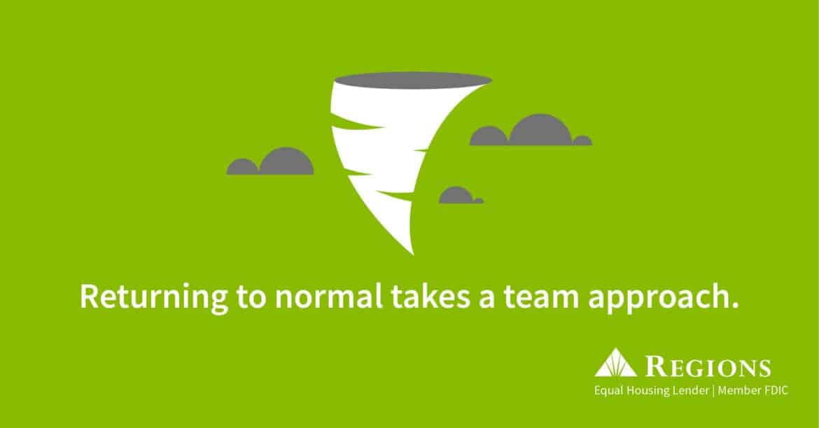 “Our teams have many years of experience providing financial advice and guidance to help people recover and rebuild following a natural disaster,” said John Anderson, Consumer Banking executive for Regions Bank. “At the branch around the corner, by calling our Contact Centers, or through regions.com, we are here to connect consumers and businesses with what they need to move forward.”