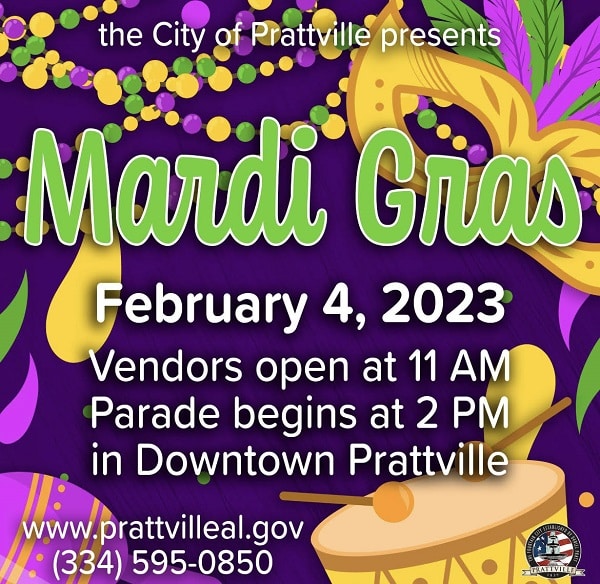 The City of Prattville is scheduled to present Mardi Gras on Feb. 4, with vendors opening at 11 a.m. and the parade is set to kick off at 2 p.m. in downtown.