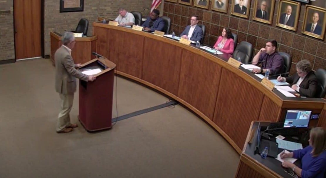 Top photo: Mayor Bill Gillespie addressing the Council concerning a lease with FEMA to rent a former bank building on Main Street which is now owned by the city. (Still photo from Council video.)