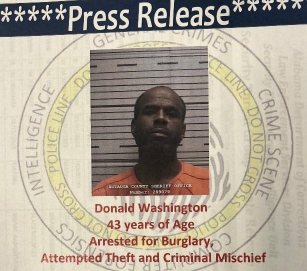 Washington was transported to the Autauga County Metro Jail and held on $22,500.