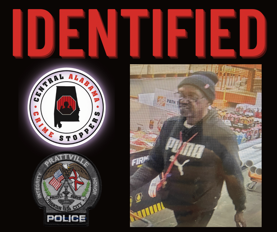 The Prattville Police Department notified Central Alabama CrimeStoppers and advised they have identified the suspect involved in a November 2022, felony retail theft investigation.