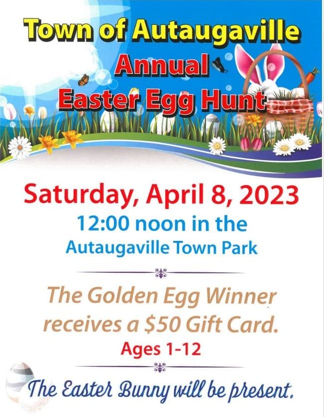 On Saturday, April 8, the community is invited to Autaugaville Town Park at noon for an Easter Egg Hunt. The Golden Egg Winner will receive a $50 Gift Card. Egg hunt is for ages 1-12.