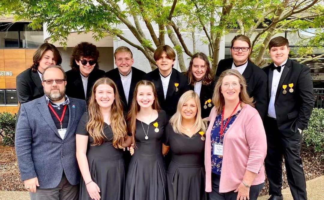 Top Photo: Front Row: Michael Bird (director), Anna Griggs, Danielle Bird, Maria Lynn, Kelley Hill (director). Second Row: Trevor Towery, Robert Towery, Alex Hughey, Gaines Nolin, Dalton Williams, Draven Haynes, Noah Crouch.