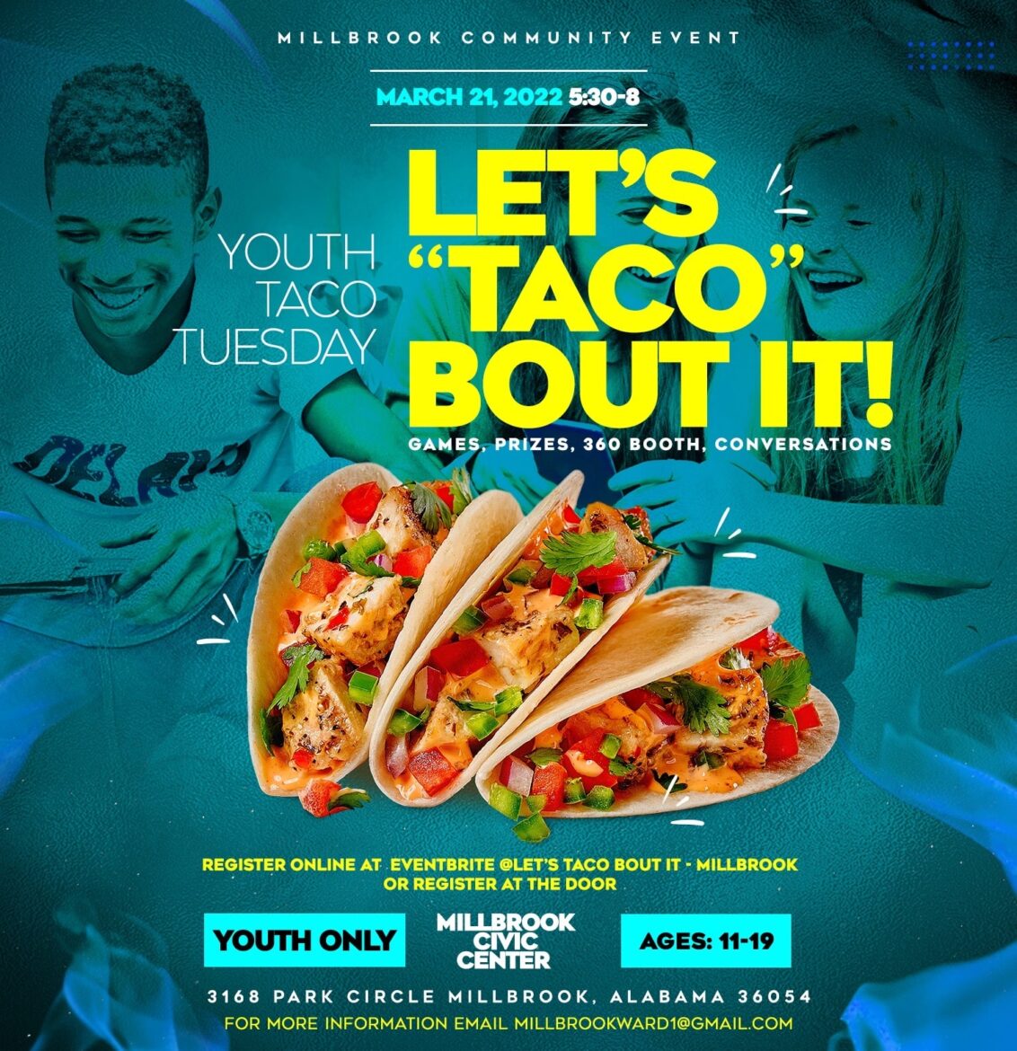 A Millbrook Community Event is coming March 21 to the Millbrook Civic Center for youth to enjoy some tacos and talk openly about what is on their mind.