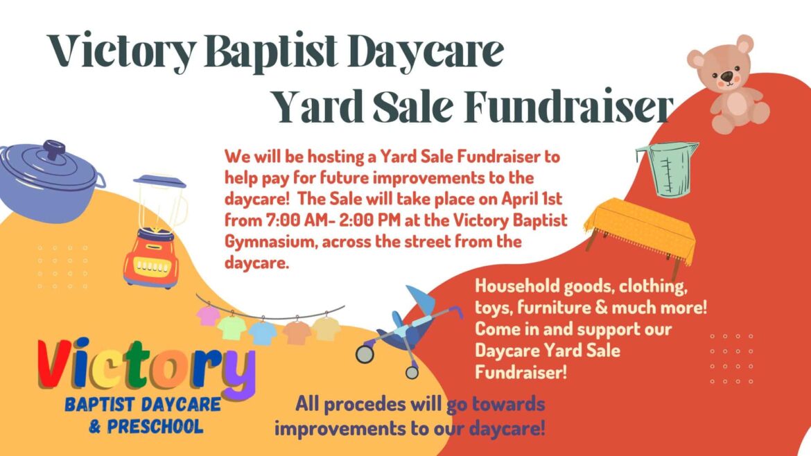 Victory Baptist Daycare will be hosting an in-door yard sale and the church gymnasium to raise money for daycare improvements! Come out Saturday morning and see what kind of treasures you might find and need for your home! Items such as clothing, toys, household goods, furniture and more will all be displayed and available!