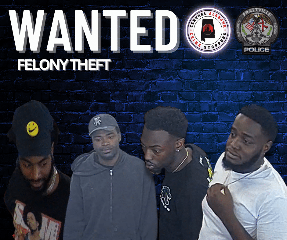 Prattville Police Investigators released a photo of four unknown subjects wanted for theft of property 2nd degree which occurred on Saturday, April 15, 2023, at Shell, located at 2591 Cobbs Ford Road, Prattville, Alabama. Investigators say the pictured suspects, described as black males, entered the business, walked out, and one suspect quickly returned to the business. The suspect walked behind the checkout counter, took $1,600.00 in cash from the register, and ran out of the store. The suspects were seen entering a 2011, Honda, CRV, and left the scene in an unknown direction of travel. There are no other details available for release at this time.
