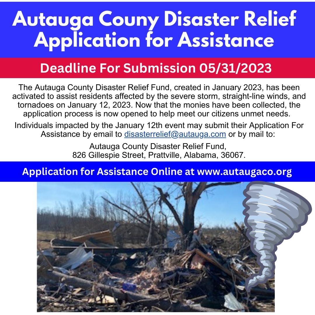 The Autauga County Disaster Relief Fund, created in January 2023, has been activated to assist residents affected by the severe storm, straight-line winds, and deadly tornado that occurred on January 12, 2023. Now that the monies have been received, the application process is opened for our citizens to help meet their unmet needs. DEADLINE FOR SUBMISSION 05/31/2023.
