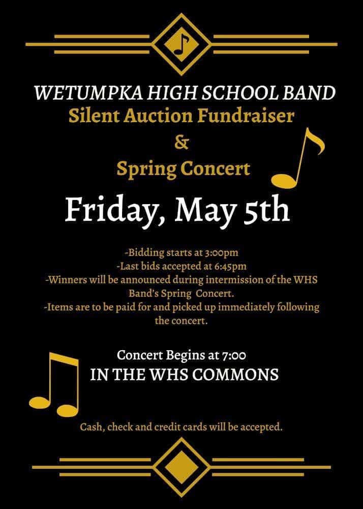 Wetumpka High School Band will hold their annual silent auction fundraiser Friday May 5th starting at 3pm. It will be held in the WHS Commons.