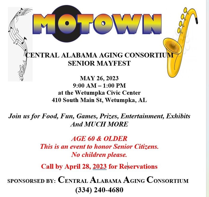 Central Alabama Aging Consortium invites you to our biggest in-person event of the year, May Fest, in honor of Older Americans Act of 1965. Around 400 senior citizens will gather at Wetumpka Civic Center to remember the oldies of Motown! The seniors have been invited from 18 senior centers across Autauga, Elmore, and Montgomery counties. This is an invitation only event that we think will give you plenty of visuals, audio opportunities, pictures, and interviews with some of our region’s most engaged seniors.
