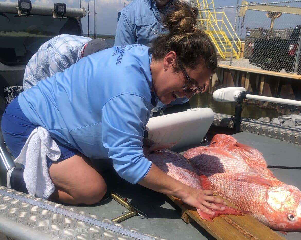 Top Photo: A field sampler with the Alabama Department of Conservation and Natural Resources collects red snapper length and weight as part of Snapper Check dockside validation.