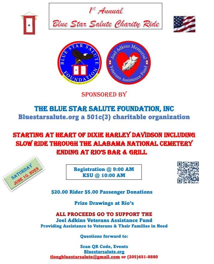 Registration for the ride will begin at 9:00am on June 10, 2023 at the Heart of Dixie Harley Davidson in Pelham, Alabama. Kick stands up at 10:00am for a 45-minute ride in North Shelby County including a slow ride through the Alabama National Cemetery in Montevallo and ending at Rio’s Bar and Grill in Helena, Alabama. Registration fees are $20 for a rider and $5 for a passenger. There will be drawings for door prizes at Rio’s at the conclusion of the event.