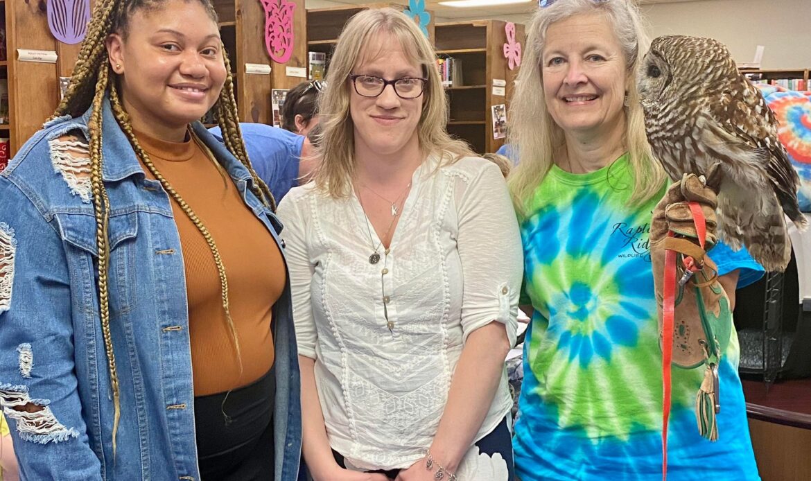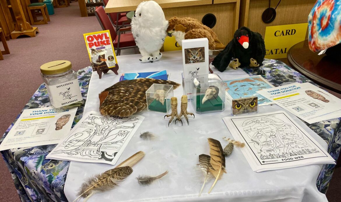 Educational Ambassador birds that were on display at the library included Grizzly, a red-tailed hawk, D’Artagnan, a screech owl, and Acuity, barred owl.