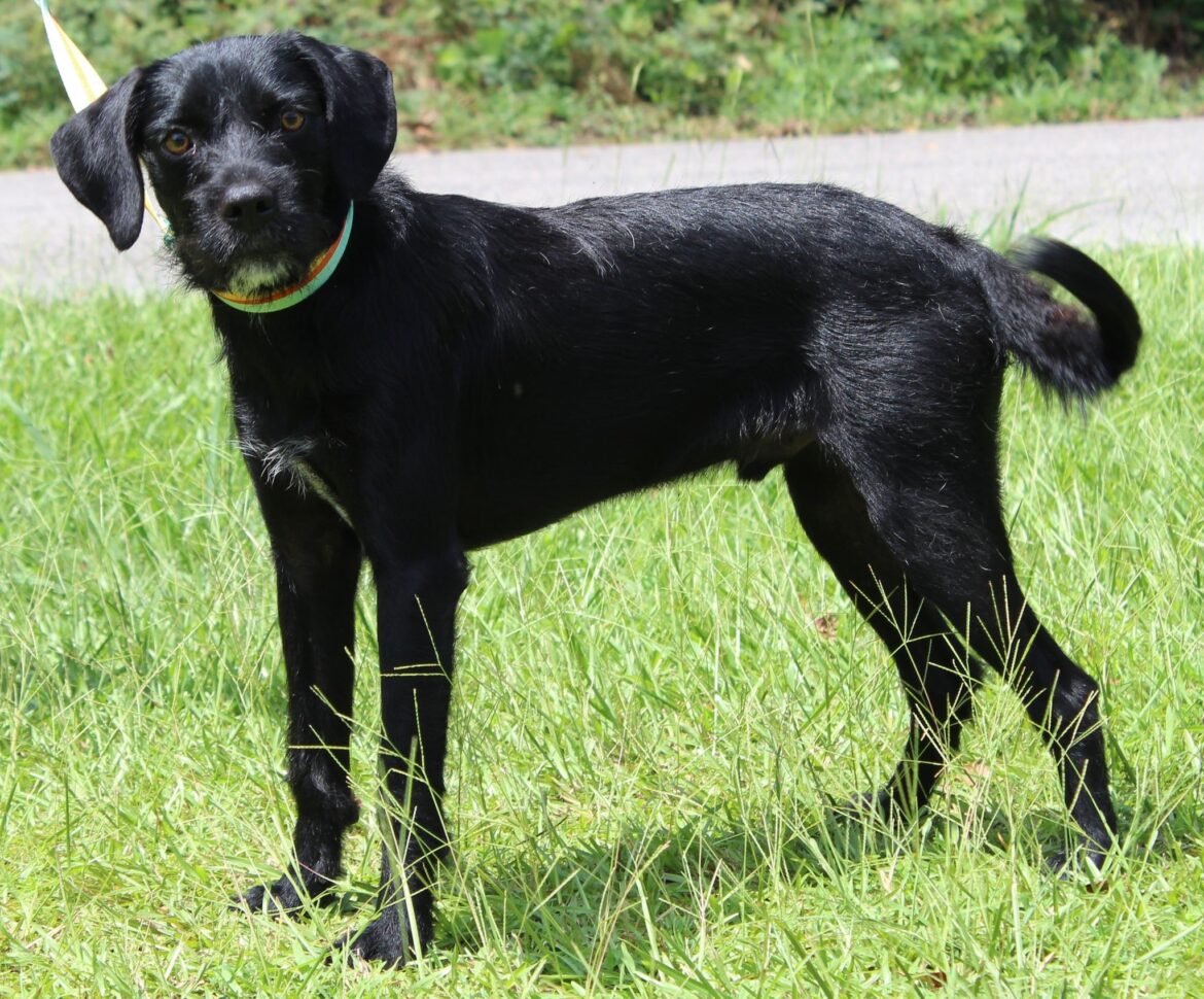Dutton is an 8-month-old male Terrier mix who has already been neutered. His coat is black with white markings under his neck; and his medium length coat has a wiry look to it. Dutton has the most beautiful, soulful eyes! He only weighs 30 pounds and he won’t get much bigger. Dutton is calm, affectionate, and super sweet. He loves to snuggle and cuddle while watching TV! At a recent adoption event, Dutton was so well behaved and loved all the attention he got! He enjoyed sitting in a volunteer’s lap most of the time! Dutton also loves toys. He would be wonderful with other dogs and children. Dutton has so much to offer his new family and he is a great size to fit in just about anywhere! We almost forgot to mention he appears to be house trained.