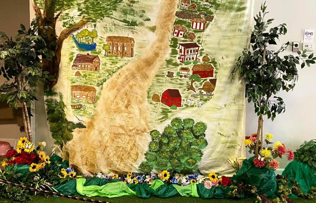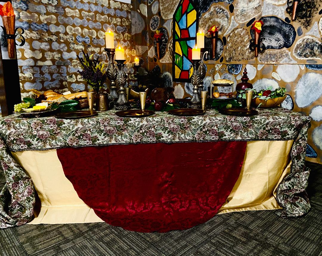 We turned our fellowship hall into a castle, complete with a throne and a kings’ table as well as stained “glass” windows and banners and shields. The walls, inside and out) were covered with hand painted paintings to resemble castle walls.