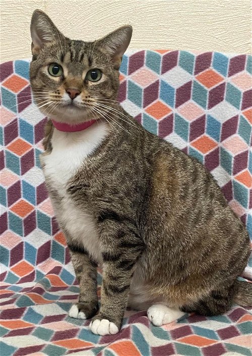 Sabrina is a two-year old female brown & white tabby, DECLAWED on her front feet so INDOOR ONLY. She is great with children, a tad persnickety with everyone else. Sabrina likes to rule her domain so best in a home with no or just one or two other pets. She is a very laid-back lady and will nibble on your fingers.