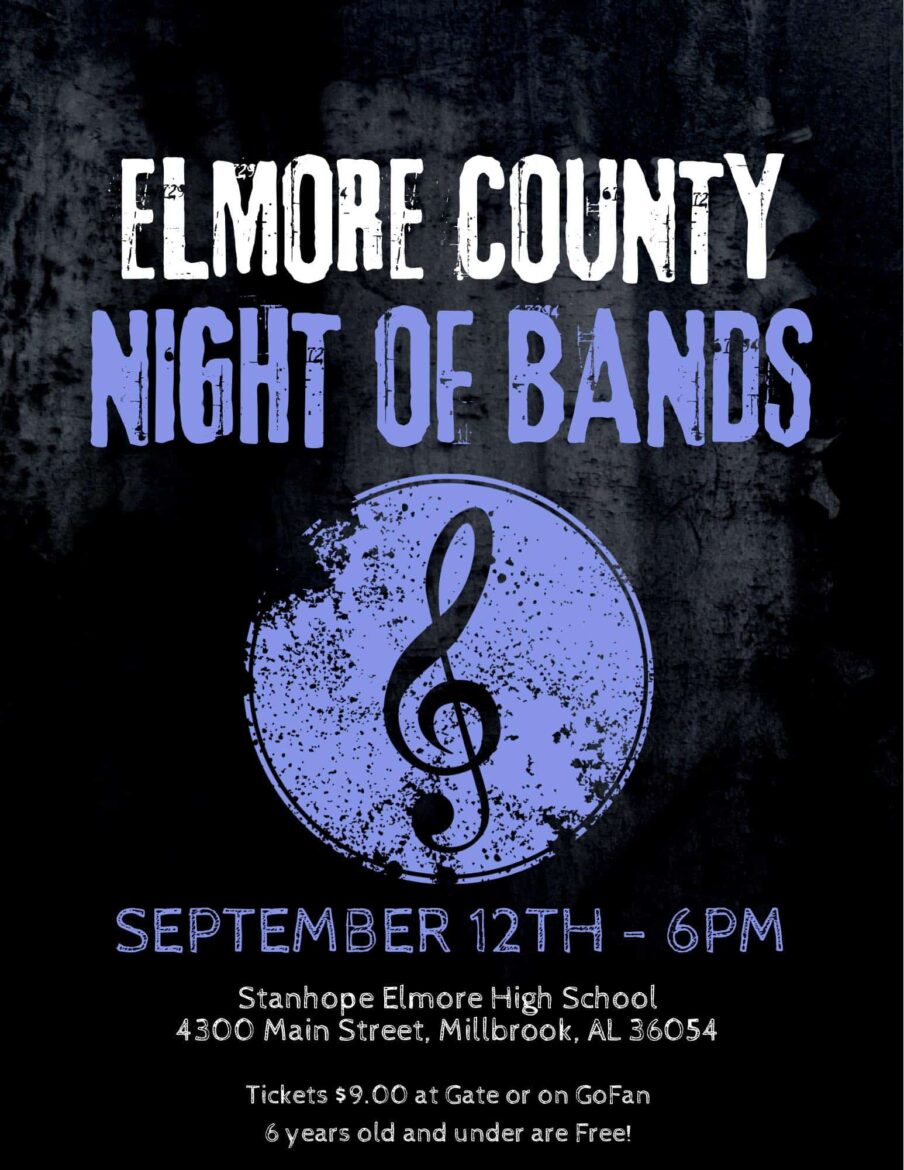 The Elmore County Night of Bands will feature the Stanhope Elmore High School, Wetumpka High School, Holtville High School, Elmore County High School, and Tallassee High School marching bands on September 12th at Foshee-Henderson Stadium. The bands will perform their half-time shows as a panel of music educators give comments to help the bands improve for their upcoming marching band competitions.