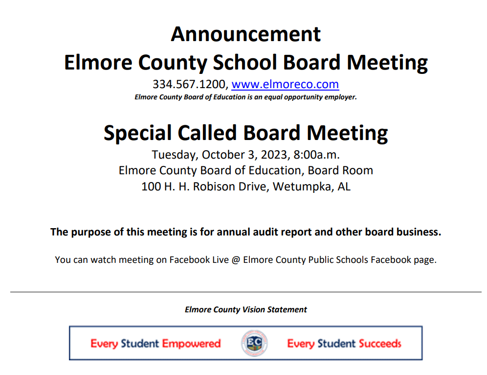Special Called Meeting is Oct. 3 to Discuss ECBOE Audit Findings
