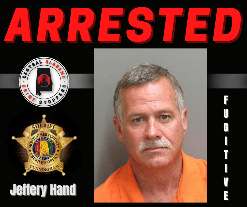 The Montgomery County Sheriff’s Office notified Central Alabama CrimeStoppers and advised they located fugitive, Jeffery Hand, 59.