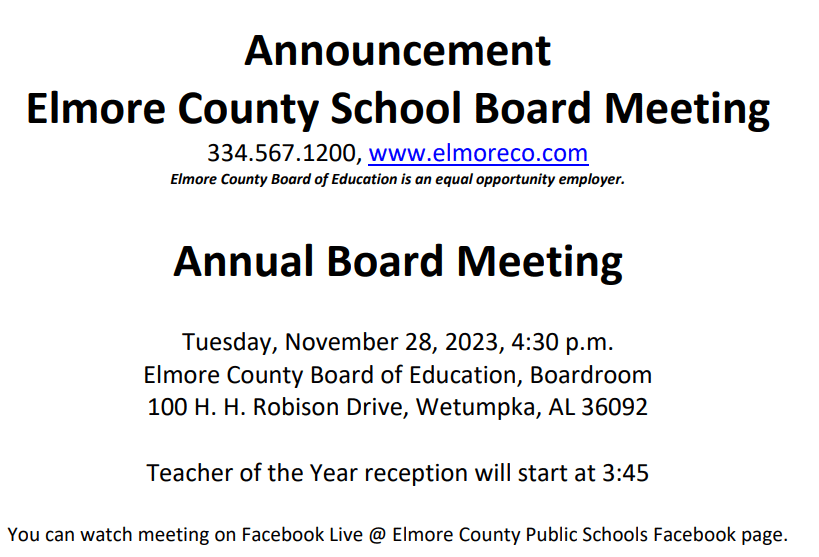 Elmore County Schools: Teacher of the Year reception, Annual Board Meeting is Nov. 28 November 8, 2023