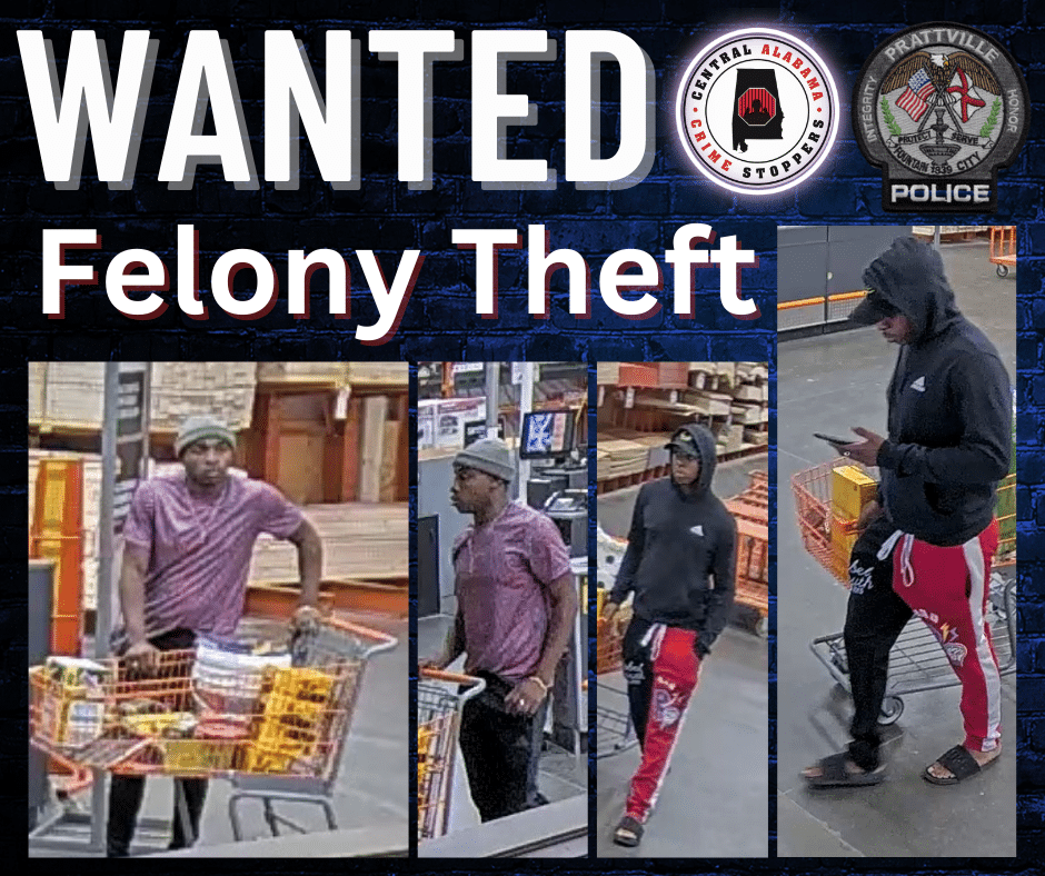 Prattville Police Investigators released a photo of two unknown suspects wanted for a felony theft investigation. Investigators say the offense occurred, on October 7, 2023, at Home Depot located at 2710 Legends Parkway, Prattville, AL.
