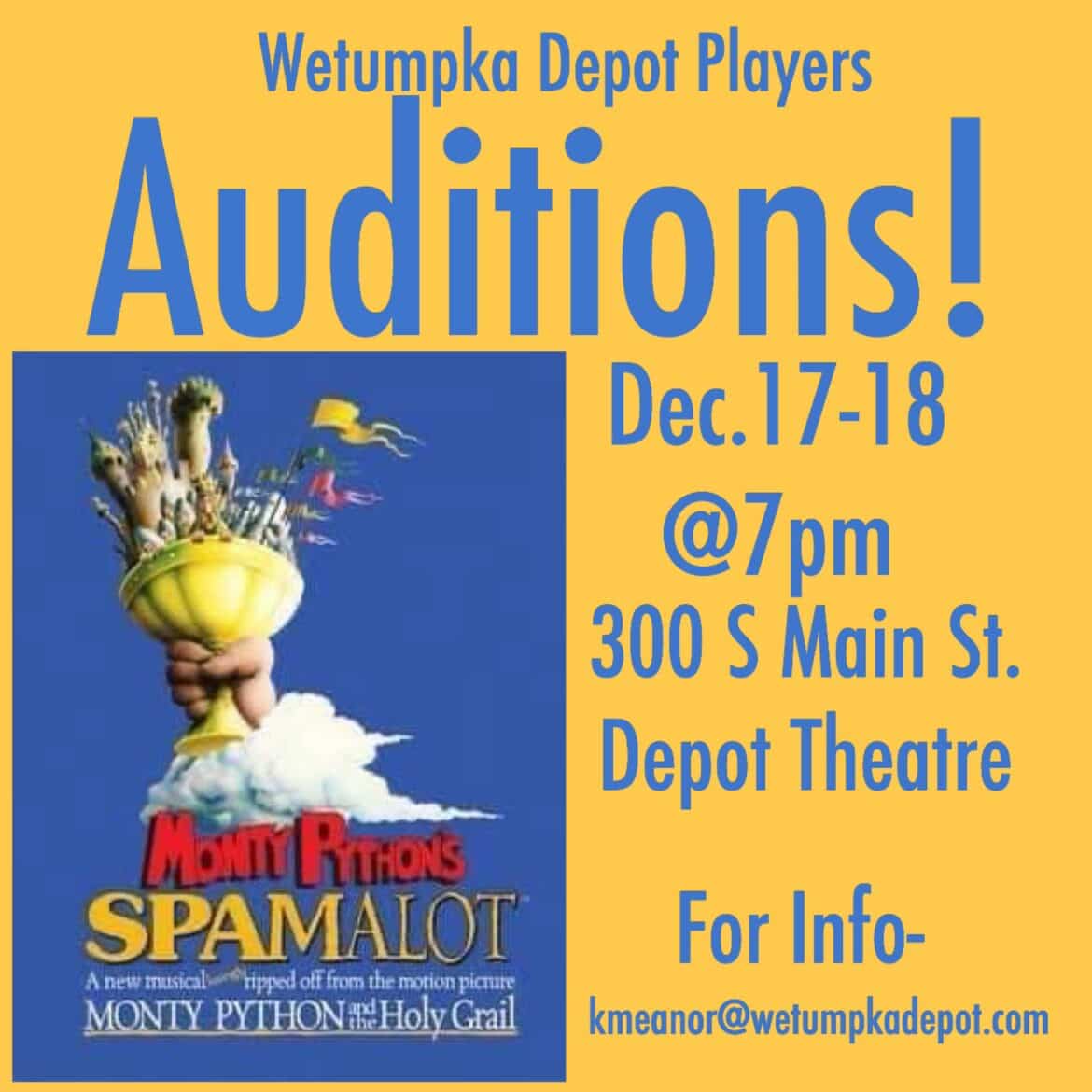 Always look on the bright side of life and join us for auditions for Spamalot at the Wetumpka Depot. We’ll be looking for the Holy Grail of casts Dec 17 and 18th, both at 7pm. Rehearsals begin January 2 and show opens February 15 and runs 3 weeks. Directed by Kristy Meanor, musical direction Randy Foster and choreography Daniel Harms. email [email protected] for information.