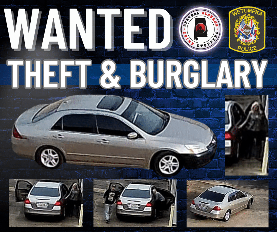 Wetumpka Police Investigators released a photo of two unknown suspects wanted for a felony theft and burglary investigation. Investigators say the offense occurred, on Thanksgiving Day, November 23, 2023, at a business located in the 4000 block of U.S. Highway 231, Wetumpka, AL.