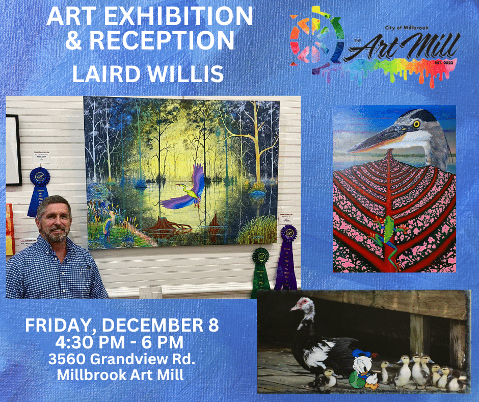 The Millbrook Art Mill welcomes Artis Laird Willis Friday from 4:30 to 6 p.m. The Art Mill is located in Millbrook at 3560 Grandview Road. The public is welcome to attend.
