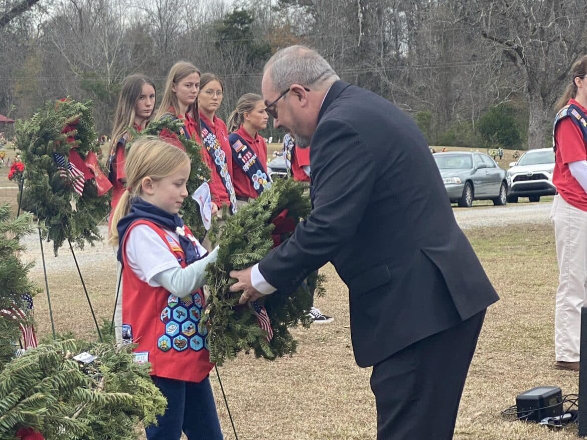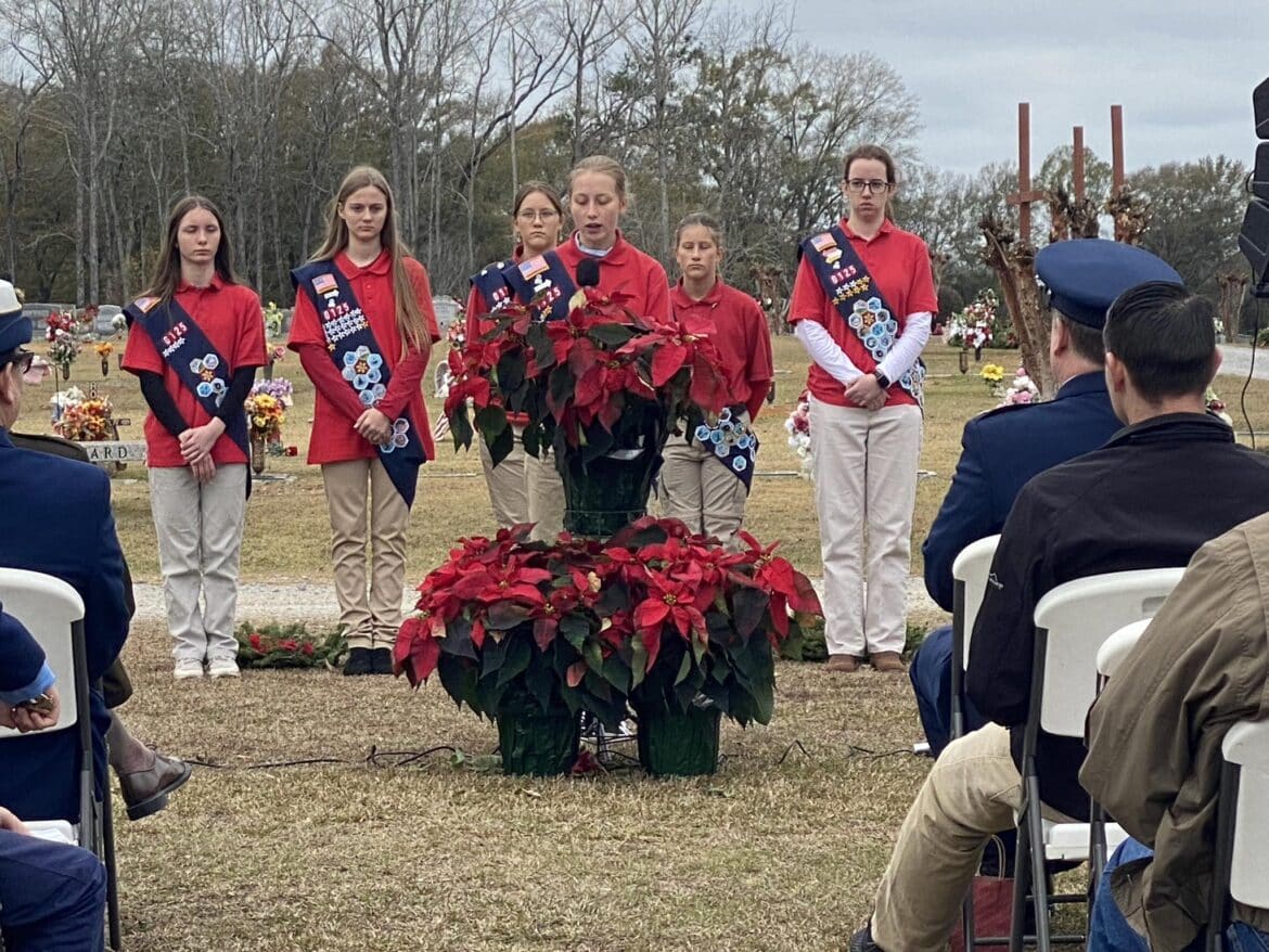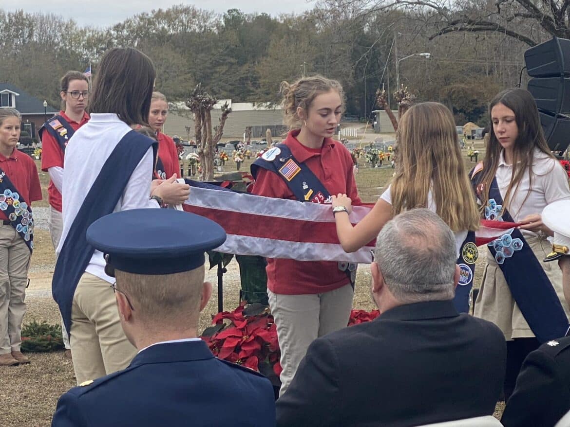 On Saturday, the American Heritage Girls Troop AL0125 hosted the National Nonprofit Wreaths Across America (WAA) event held at the Brookside Memorial Gardens in Millbrook. This is the sixth year the cemetery has participated in the National program. The Wreaths Across America’s mission is to REMEMBER the fallen, Honor those who serve and their families, and Teach the next generation the value of freedom.  Across the country, 4,225 memorial sites participated and had over 2.9 million wreaths. There were approximately 65 planned events that participated in the Wreaths Across America across Alabama.