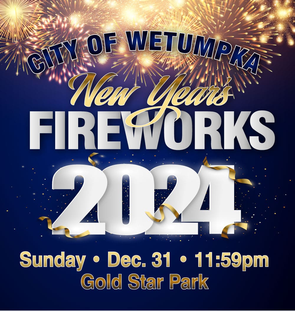 Everyone is invited to view the New Year’s Eve fireworks that will shot into the skies over Wetumpka. The official event is occurring at Gold Star Park, but there are amazing viewing points throughout the city. The fireworks will begin promptly at 11:59 p.m. on New Year’s Eve! Ring in the year with a beautiful fireworks show!