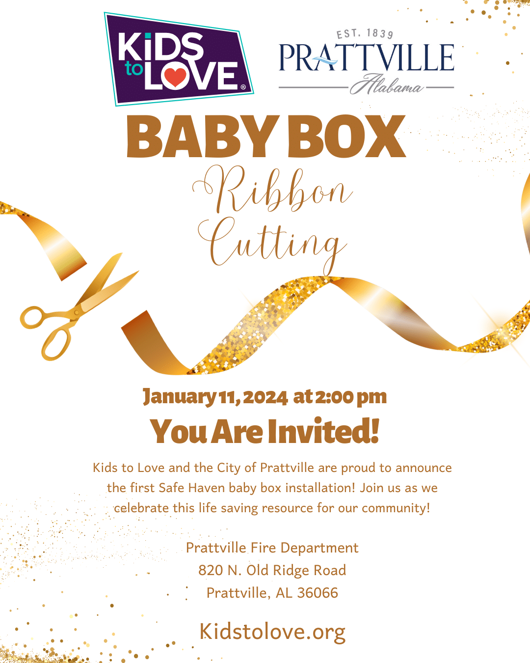 In partnership with Kids to Love and Safe Haven Baby Boxes, the City of Prattville will host a Baby Box Blessing and Ribbon Cutting Ceremony on January 11, 2024, at 2:00 p.m. The ceremony will be held at the Prattville Fire Department Station 4, 820 N. Old Ridge Road, Prattville, AL 36066.