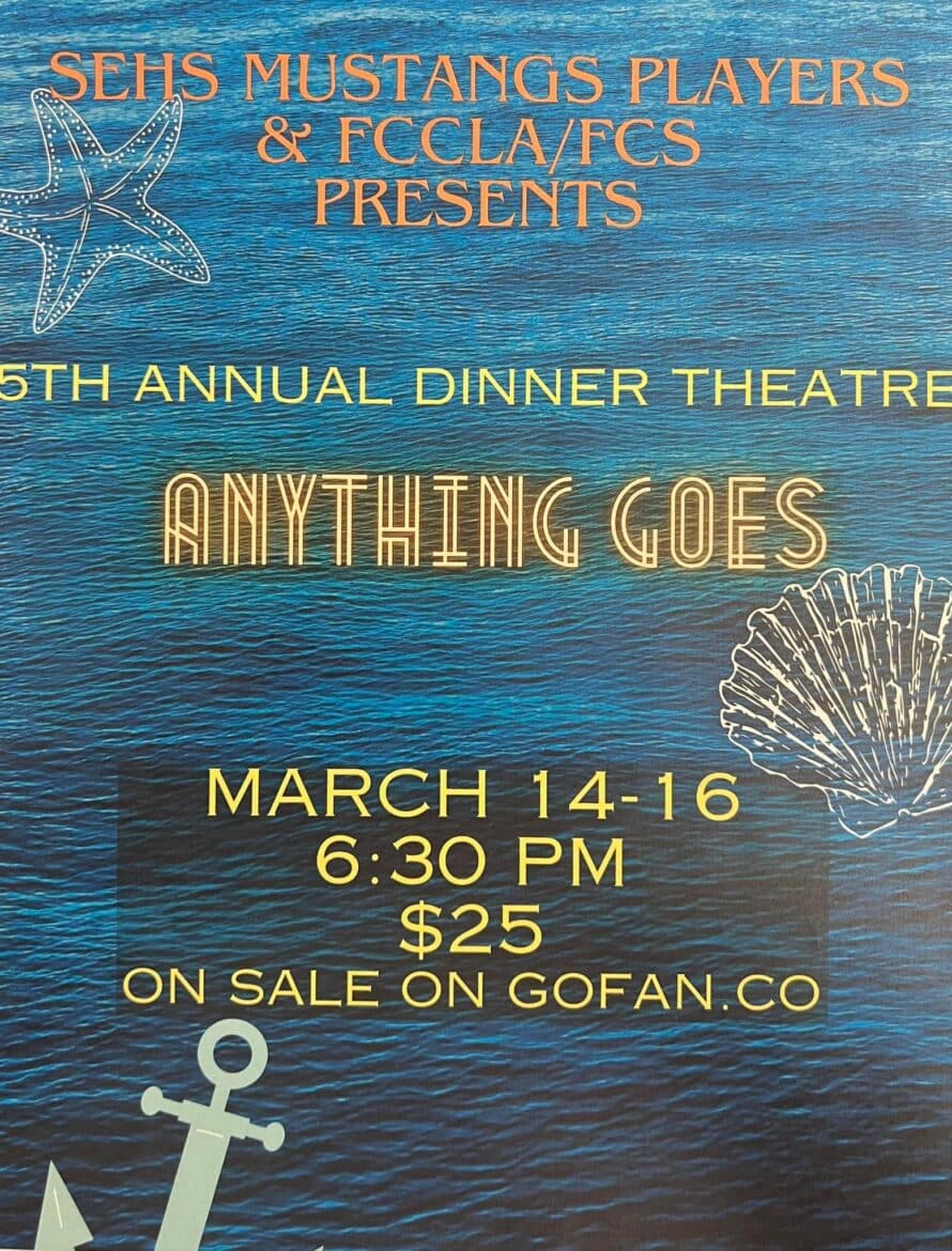 It’s that time again. Stanhope Elmore’s FCCLA Career Tech Service Organization, FCS Classes, the SE Mustang Players, and Millbrook Middle School Theatre Department are excited to bring to our community the 5th annual dinner theatre, ANYTHING GOES! For anyone that has been to dinner theatre they know the hard work these organizations put into making this event successful for Stanhope Elmore High School. For those who have not been, get tickets and make plans to attend this evening of fun, delicious food, and an exciting musical theatre performance. The dinner theatre serves as an annual fundraiser for FCCLA and theatre. This event helps the students involved with this event to be able to attend conferences, participate in various events, purchase rights to shows, etc. to make their organizations successful.