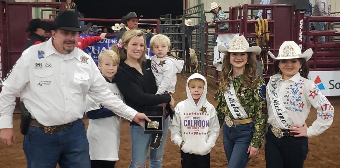 Top Photo: Autauga County Sheriff Mark Harrell presents a buckle to the Mutton Bustin’ winner, Carter Batts, from the Friday night competition. With him are family and rodeo queens to help him celebrate.