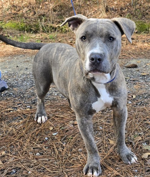 Echo is a 1 1/2-year-old male Pit mix found as a stray and never reclaimed. He is about 60 lbs, goofy, funny and super loving. Echo is good with male and female dogs and scared of cats. He is very playful and then wants to be a big lap dog.