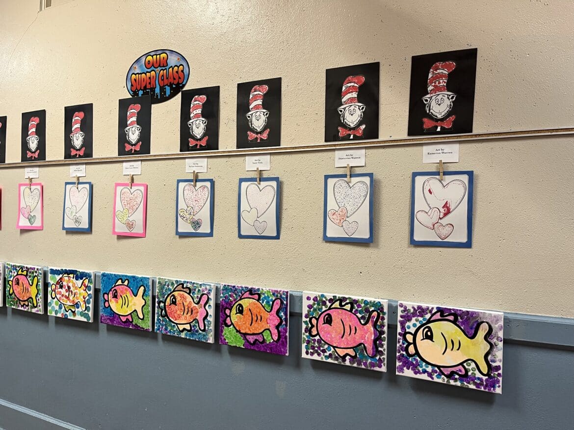 “We practiced pointillism in our class, and our students did heart art, and some Cat in the Hat as it is Read Across America Week. We practiced pointillism with that as well. This was one of the ways we wanted to give them an opportunity just to see different things and perspectives. Not just the usual academics, but also to express who they are. My children have great talent and to see the kids say, ‘wow this is what I created,’ and for them to be so proud of what they have done has been wonderful to watch,” PKS teacher Wilshelia Ezell in room four said with a wide smile.