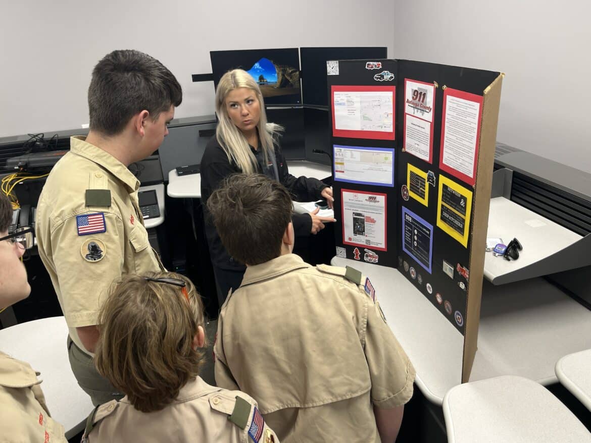Members of the 911 center, Emily Herring and Caleb McGowin, were on hand to explain to the Scouts what the purpose and role 911 plays during an emergency and how the process initiates, with a call to the center from an impacted member of the community, to how it is dispatched to all the emergency services needed.
