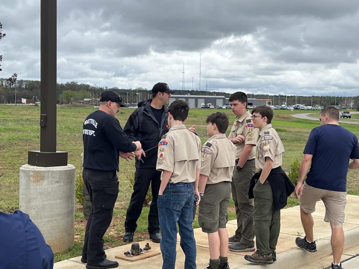 The participants from BSA Troop 25 participated in a practice drill with the Prattville Fire Department (PFD) and Autauga County Emergency 911 Communication Center. The project was conducted at Fire Station #4 due to having the alternate 911 center co-located within the facility.