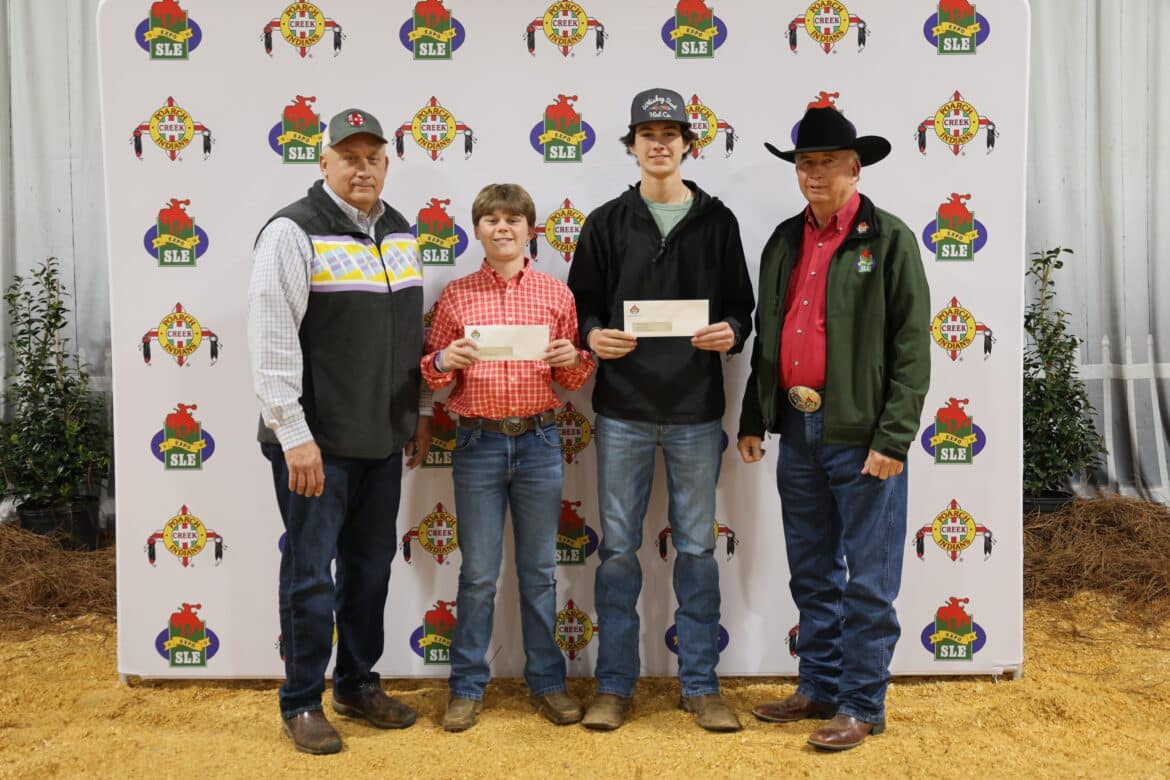 MONTGOMERY, Ala— Caleb Cook, Plantersville, and Tanner Truesdale, Billingsley, were each awarded a scholarship by the Poarch Band of Creek Indians (PBCI) for their participation in Alabama’s livestock industry on Sunday, March 17 at a ceremony held in coordination with the Southeastern Livestock Exposition (SLE) Rodeo. Pictured L-R are PBCI Tribal Council Member Keith Martin; Cook; Truesdale; and SLE President Frank Ellis.